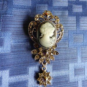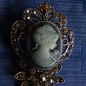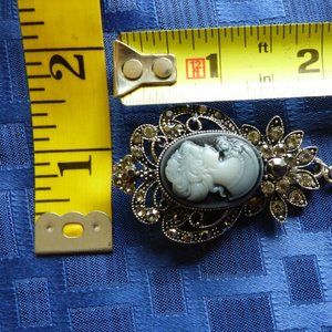 Beautiful very sparkly Cameo Pin. Silver Part looks tarnished with Marcasite looking crystals to give it the Victorian look. Background of Cameo is navy blue with a light blue tarnished woman face. Please see measurements in the last picture.......