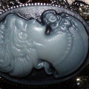 GOTH VICTORIAN VAMPIRE SILVER FAUX MARCASITE CRYSTAL BLUE CAMEO PIN BROOCH