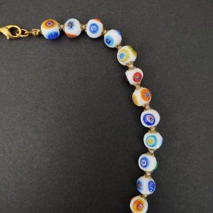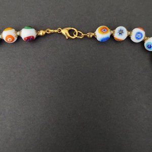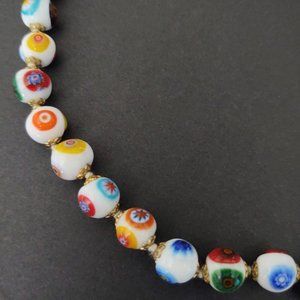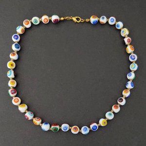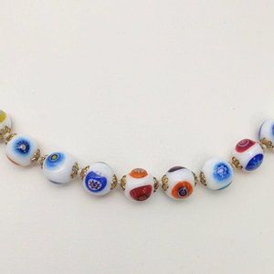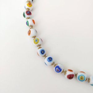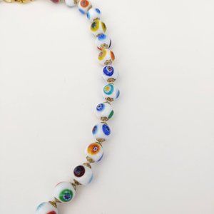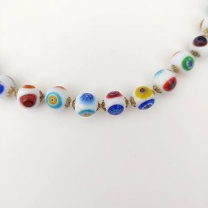 White glass beaded necklace w/multi color designs