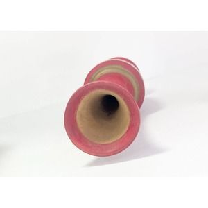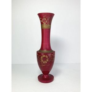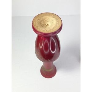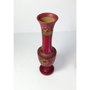 2 Matching Handmade & Painted Red Wooden Vases w/Applied Gold Floral Motif 10.5”.
