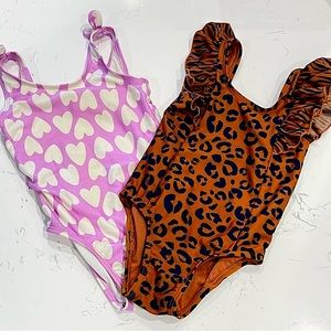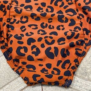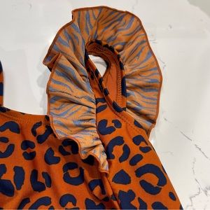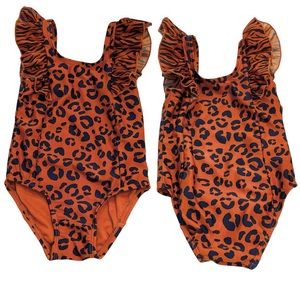 This super adorable one-piece swimsuit is a gorgeous color with a fun leopard animal print on the body and a tiger print on the ruffled straps. Color is rust/dark orange cognac copper w/ black animal print markings (leopard print all over body & tiger print ruffled straps. 🧵DETAILS:•Size 2T•Shell: 83% Recycled Polyester, 17% Spandex•Lining: 100% Recycled Polyester•Ruffled Straps cascading around shoulder•Machine Wash Cold;Tumble Dry Low