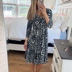Gorgeous like new dress in a black and white animal print. Sleeves are three quarter, seam under breast area which allows for a beautiful flow of material. Neckline is pleated and v-neck for a very complimentary look. Measures 18” pit to pit with extra stretch if needed and pit to hem is approximately 29.5” long.