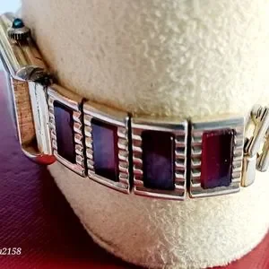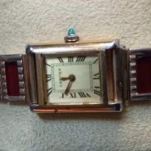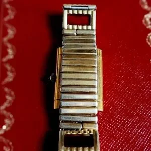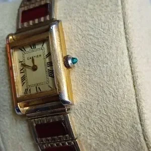 This vintage ladies' Cartier gold-tone tank wristwatch is a stunning addition to any collection. The watch features 8 garnet panels that add a pop of color to the design. The brand, Cartier, is well-known for its luxury watches, and this model, the Cartier Gold-Tone, is a timeless piece that exudes elegance.