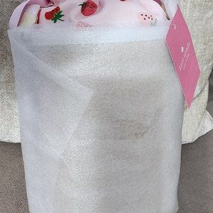 Strawberry design, straw smooth leather trim, metal logo, adjustable strap, cotton twill lining and drawstring closure.