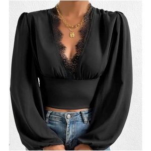 Plunging Neck Lace Bishop Long Sleeve Lace Cropped top