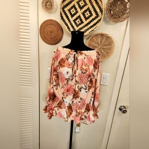Introducing a beautiful off-the-shoulder blouse from Ditzys Boutique, available in size XL and 2XL. This stunning piece features a colorful floral print on a soft polyester material, perfect for any occasion. The long sleeves add a touch of elegance to the overall look, making it a must-have addition to any wardrobe. Whether you're attending a special event or simply want to elevate your everyday style, this blouse is sure to make a statement.