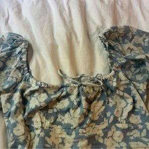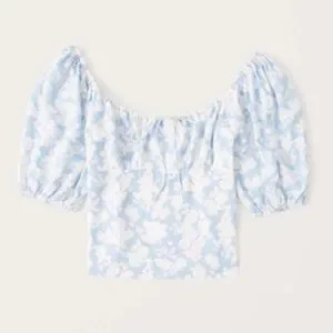 Gorgeous floral top from Abercrombie and Fitch. Blue and white floral print, linen blend material, fitted in the bodice with a scrunched elastic back with big puff sleeves, elastic shoulders so it can be worn on or off the shoulder, adjustable tie lets you adjust the neckline. So flattering!
