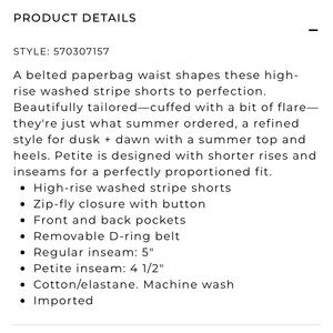 A belted paperbag waist shapes these high-rise washed stripe shorts to perfection. Beautifully tailored—cuffed with a bit of flare—they're just what summer ordered, a refined style for dusk + dawn with a summer top and heels.