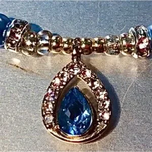 Liz Claiborne(signed) teardrop pendant blue faceted teardrop rhinestone surrounded by clear round rhinestones, gold tone finish