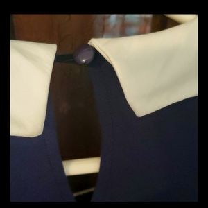 Navy dress with small flare at skirt accented by White collar & cuffed sleeves, left side zipper