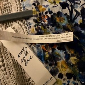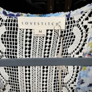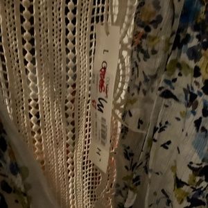 Really pretty Boho style top. NWT. Great back with a pretty ivory crochet style inlay? Open front and elastic across fron bottom to make it gathered. Bell sleeves. Ivory with blue multi flower design. Has that water color look.