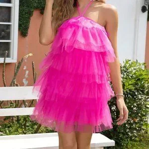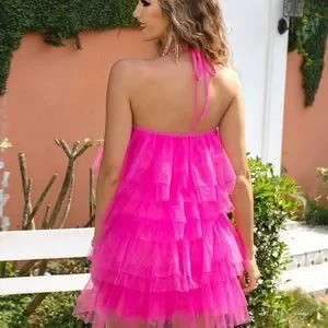 Pink Boho Womens Tie Backless Layer Hem Mesh Halter Dress