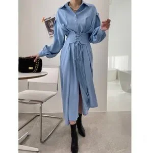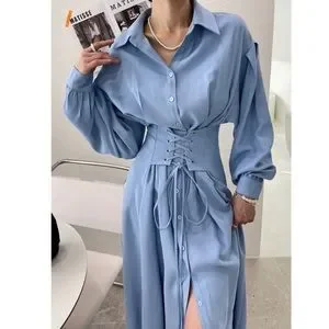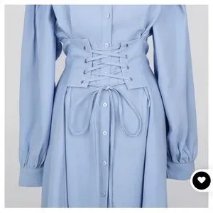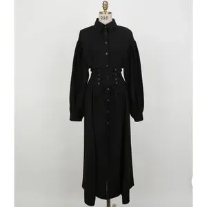NWOT Korean Brand Black Corset Lace Up Long Belted Button Down Dress