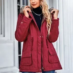 Red Preppy Womens Fuzzy Trim Hooded Drawstring Waist Teddy Lined Parka Coat
