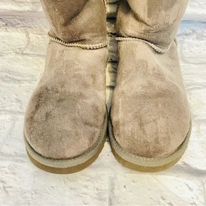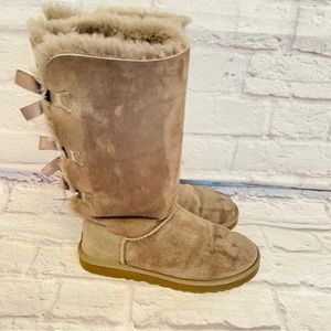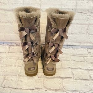UGG Bailey Bow Gray/Taupe Genuine Shearling Suede Tall Boots Women's Sz 8