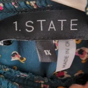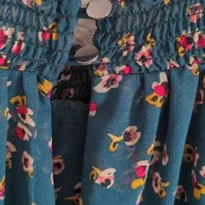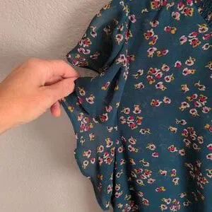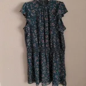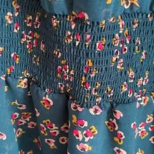 Gorgeous dress! This pretty floral pattern is cream, light and dark pink, black and gold / mustard yellow on a forest green background. Sheer ruffles at the shoulders and arm holes, plus smocking at the mock turtleneck neckline and waist. Layered ruffles at the hemline.