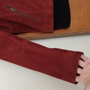 100% suede goat leather. slight puff aleeve. fully lined in a gray cotton tshirt material. dark red. nwt