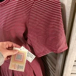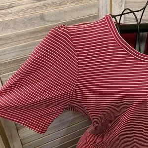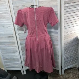 This Amelia is a maroonish red with this thin white stripes and in some lights it looks like a deep rose perfect fall color!! The Amelia dress' stretchy knit fabric is comfortable enough to let you wear the dress all day while having the structure and tailoring that make it sophisticated enough for the office or a fancy night out. The dress features handset box pleats, giving the dress a flowing, full skirt. And before we forget the best part, this dress also has hidden pockets!