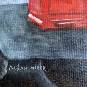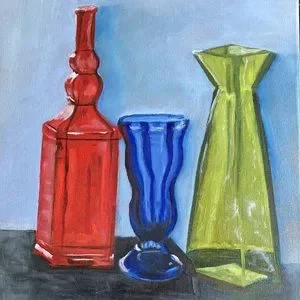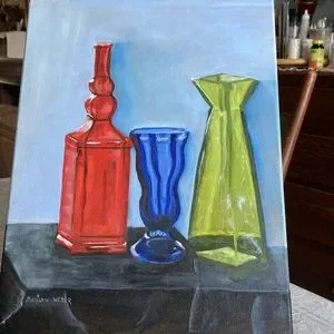 Colorful still life with red, blue and green glass bottles, 12” x 16” $175