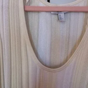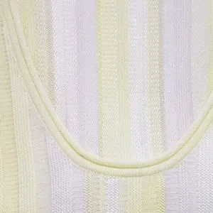 Cotton-blend midi dress knit with variegated white and cream stripes. Scoop neck and voluminous skirt.