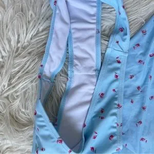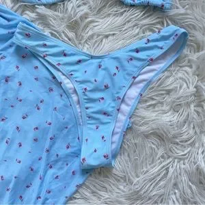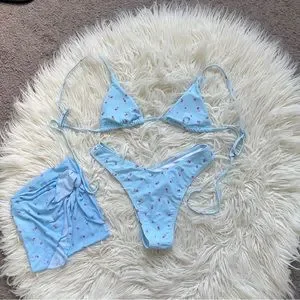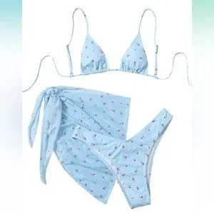SOLY HUX 3 Piece Triangle Bikini Set with Mesh Cover Up Beach Skirt Blue Floral