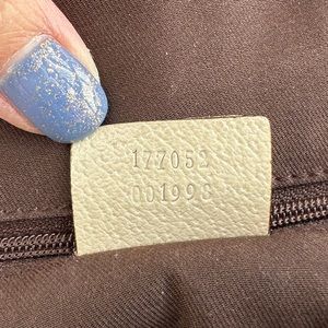 DESCRIPTION: This preloved Gucci Medium Prince Tote handbag features the GG web design in Gucci fabric canvas exterior with light cream/off white leather accent on trim, front and back corners, handles and around zip closure. Also accented with the iconic red and green Gucci ribbons. The handles are upright and sturdy and long enough to wear as a shoulder bag. Gold hardware.