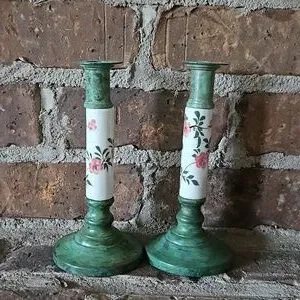 Green Painted Brass and Floral Porcelain Candlestick Holder