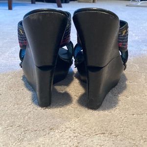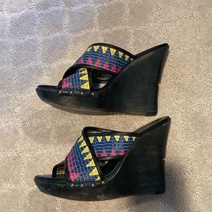 Colorful and fun wedge sandals in pink, blue and yellow. Dark brown/black wooden heel. 5in heel, 1in platform. TTS, in good used condition