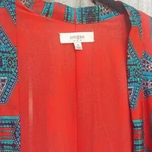 Umgee red and aqua blue Satiny print shell lined in matching red silky material. Open cardigan kimono style top with loose leisure fit. So easy to dress up or down. Bold beautiful pattern.