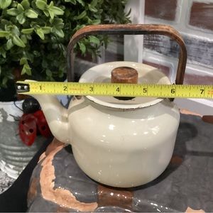 🟤 Vintage - Cream colored, enamel coated, Tea Kettle w/ Wooden Handle - Decor