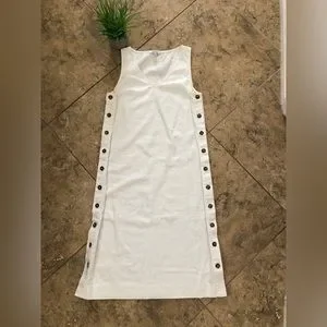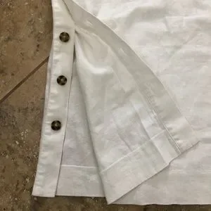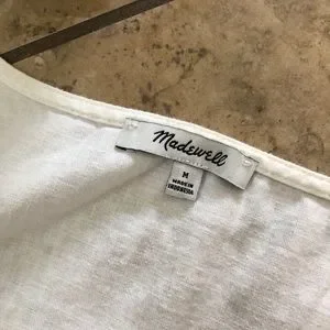 Madewell white linen dress, size medium. Sleeveless and v-neck. No pockets. You can unbutton the bottom 3 buttons. 55% linen, 45% cotton. Approximately 42” in length. It is slightly sheer.