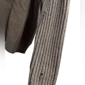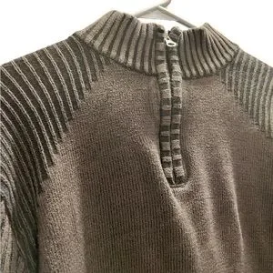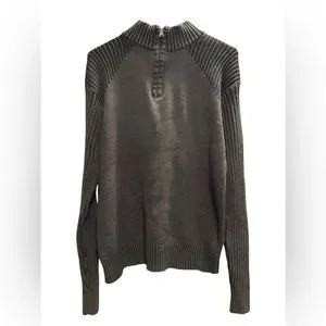 BKE mock neck sweater with zipper. Size L. Appears to be more of an athletic fit. There are 2 small holes on the back of right arm as shown in photos. Color is like an army green.