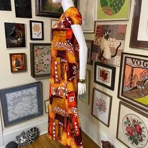 70s Vintage Kini Pela Hawaii Brown Orange Yellow Barkcloth Short Sleeve MuuMuu S