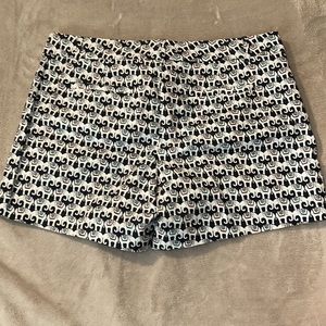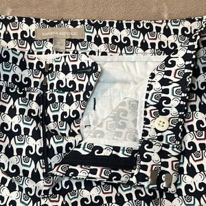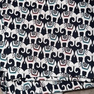 Fun elephant print. Button and tab closure. 17.5” waist. 5” inseam. Navy background. Pink and teal elephants.