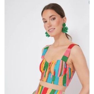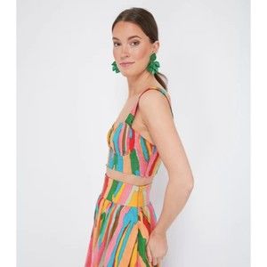 NWT Emporio Sirenuse Positano Womens Size 44/US 8 Pink Dahlia Abstract Linen Crop Top MSRP $628.00 *Matching Maxi Skirt Sold Separately* Sweetheart neckline Wide shoulder straps Underwire support Side zip closure Smocked back Raw trim Cropped hem Material: 100% Linen Care: Dry clean Made in India