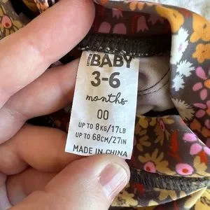 Brown with multi-coloured flower design and sleeve ruffles. Back zip for easy on and off. Fully lined - polyester and elastane blend. Size 00 (3-6 months - up to 8kgs or 68cm).