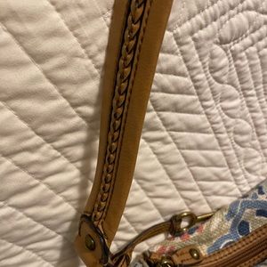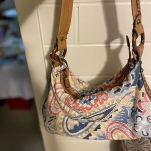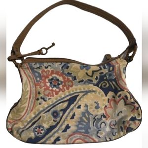 Beautiful Braided and smooth leather handle with a cloth body. Great colors with Pinks and blues against the tan and cream in a boho chic paisley style pattarn. Has the Fossil Key charm attached. Hobo style bag. perfect Pre-loved condition.