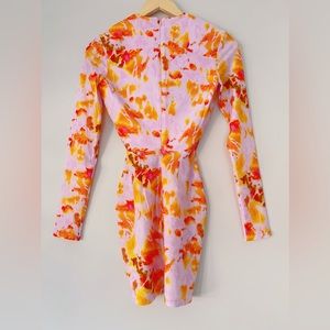 ALEX PERRY featuring multicolour, tie-dye print, round neck, long sleeves, ruched detailing and concealed rear zip fastening.