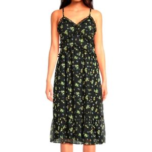 NWT deep v-neckline with ruffle trim, invisible zipper, no pockets midi-dress. Length 36 in. Material polyester. Color Black soot. 1 size Small 3/5 Junior's and 1 Size XXL 19 Juniors