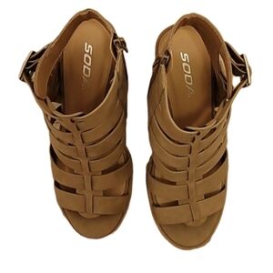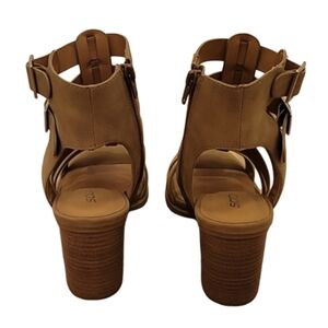 Tan shoes with chunky heels, open toes, two buckles, and zipper closer on back. Like new.