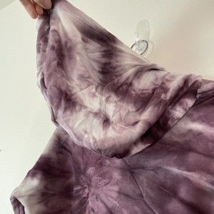 Pullover hoodie. Hooded sweatshirt with drawstring around hood. Cropped length with a rolled, raw hem. Hi low hem. Long sleeves. Purple and white tie dye. Stretch. Size medium. Approximate Measurements: Armpit to Armpit: 22.5 Length: 16-19