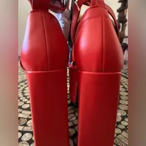 These heels have a vegan leather construction, triple stacked platform soles, block heels, a strappy wraparound design, and adjustable buckle closures.