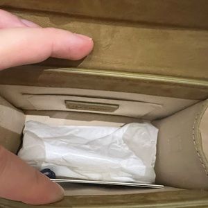 Top-handle, flap closure at front, branded metallic plaque at front, gold-toned hardware, one main compartment, internal card slot, debossed brand patch at interior, fully lined