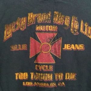Nice, vintage Lucky Brand MFg Co.Ltd, Motorcycle Blue Jeans Too Tough To Die shirt! Los Angeles, CA! First 3 pictures are of the back! 4th is of the front! Size XL!