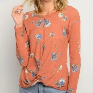 Rust colored waffle knit floral pattern long sleeve top. 77% Polyester, 17% Rayon, 5% Spandex. Machine washable.