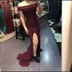 Faviana Bordeaux Jersey Off-The-Shoulder Dress