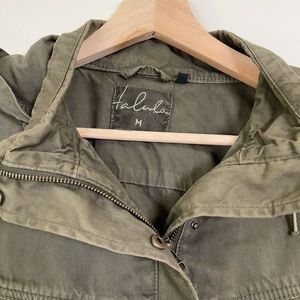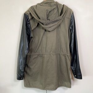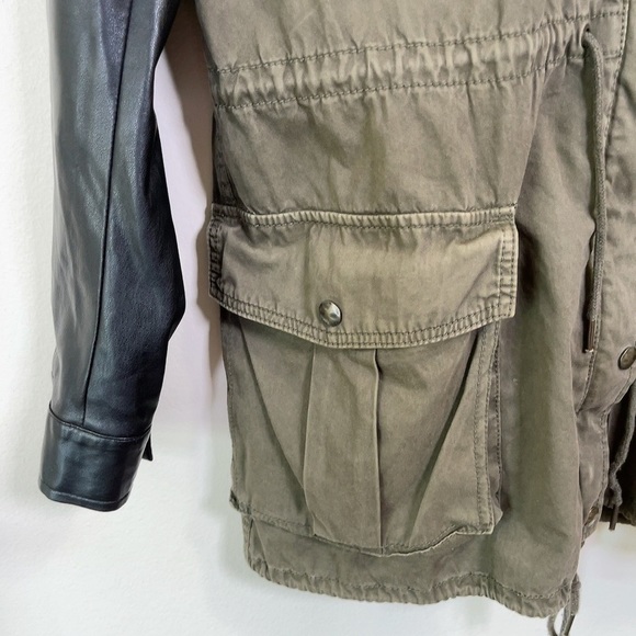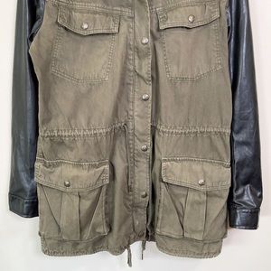 WHAT: Army green utility jacket with black faux leather sleeves. Four button pockets at the front. Drawstring at waist