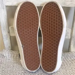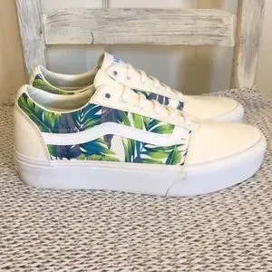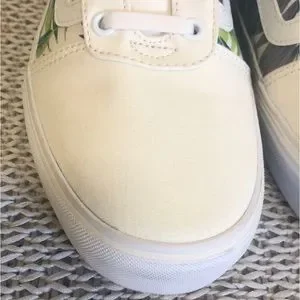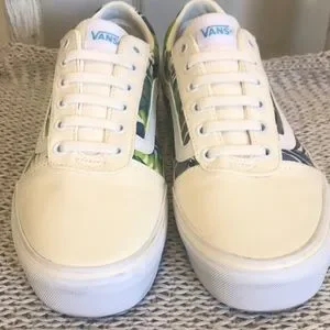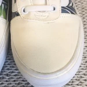 Vans Old Skool sneakers are in EUC. Creamy white canvas upper with a nice contrasting tropical print. Laces have been replaced with stretch laces (pic 14) for easy on and off and a more streamlined look. These can be easily removed and replaced with traditional tie laces if you prefer. Shoes are in like new condition just showing some super light soiling on the textured area of the white rubber sole. Smoke free home.