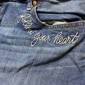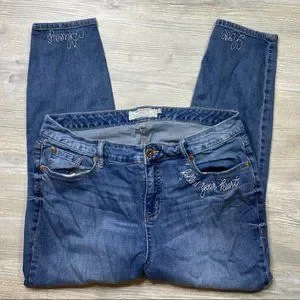 Torrid Girlfriend stretch skinny jeans. Embroidered with “Follow Your Heart” “Love” and “Always.” Size 16R. In great used condition. Zoom in to photos to see details & ask all questions before purchasing. Non-smoking home. No trades and no modeling pics. Open to offers through the offer button! Bundle 2 or more items for a better discount.