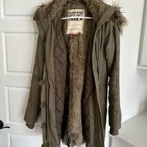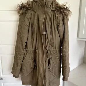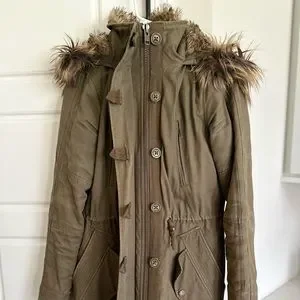 Very warm army green parka with fur lined hood, longer in the back & cinches at the waist!